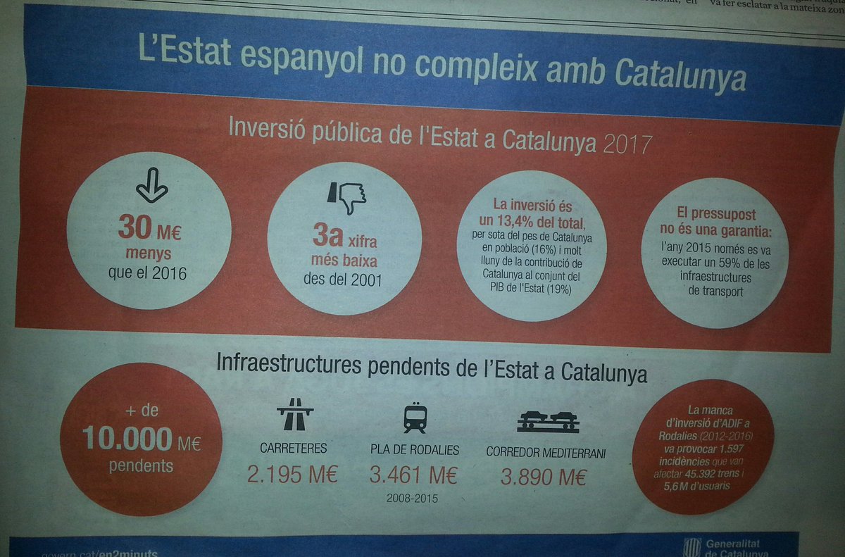 Entre les dades de què la Generalitat informa amb l’espai, destaquen 2.195 milions d'euros d’incompliment que corresponen a carreteres, 3.461 milions al Pla de Rodalies i 3.890 milions al Corredor Mediterrani. A més, assegura que la “manca d'inversió” a Adif va provocar 1.597 incidències (entre 2012 i 2016) que van afectar 45.392 trens i 5,6 milions d'usuaris. També recorda que, segons els pressupostos de 2017, l’Estat té previst invertir 30 milions menys que l’any passat a Catalunya, cosa que representa un 13,4% del total, “per sota del pes de Catalunya en població (16%) i molt lluny de la contribució de Catalunya al conjunt del PIB de l’Estat (19%).