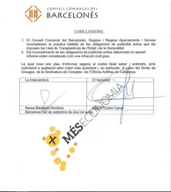Els autors del document, al qual ha tingut accés Més Economia, el van fer arribar també a la Sindicatura de Comptes, al Síndic de Greuges i a l’Oficina Antifrau de Catalunya. Entre les dades que mancaven al portal de transparència de l’ens, hi ha informació respecte a la concessió d’obres públiques i contractes de gestió de serveis públics, els objectius concrets dels plans i programes anuals o plurianuals o els convenis subscrits….