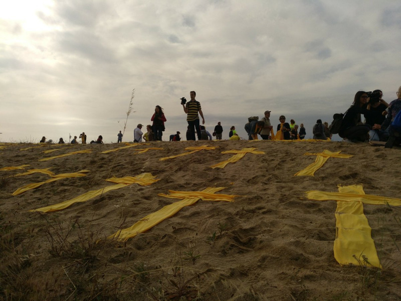 Unes 150 persones han estès a la sorra fragments de tovallola groga en forma de creu. Han reconvertit així la plantada de creus que s'havia anunciat inicialment a les 8 del matí en defensa de la “llibertat d'expressió” i per l'alliberament dels “presos polítics”.
