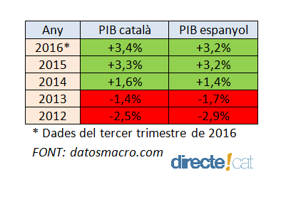 Rivera menciona el PIB per exemplificar els suposats efecte negatius del procés, però les dades constaten que des de fa 5 anys, el 2012, el Producte Interior Brut català sempre ha crescut a un ritme més alt que l’espanyol o bé sempre s’ha reduït a un ritme més baix que l’estatal. Així, el 2012 queia quatre dècimes menys que l’espanyol, mentre que l’any següent baixava tres dècimes menys. El creixement era dues dècimes superior a Catalunya el 2014, una dècima el 2015 i dues dècimes de nou fins el tercer trimestre de l’any passat, l’últim període del qual es tenen dades.