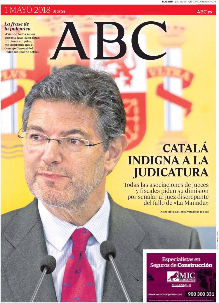 La justícia espanyola ha sortit en massa a defensar el jutge Ricardo González, el magistrat que va emetre un vot singular en la sentència de ''la manada''. El ministre Catalá va carregar contra ell i el va acusar de tenir uns expedients oberts. Ara, diverses associacions de jutges demanen la dimissió del ministre, tal com recull l'ABC, que titula: “Catalá indigna a la judicatura”.