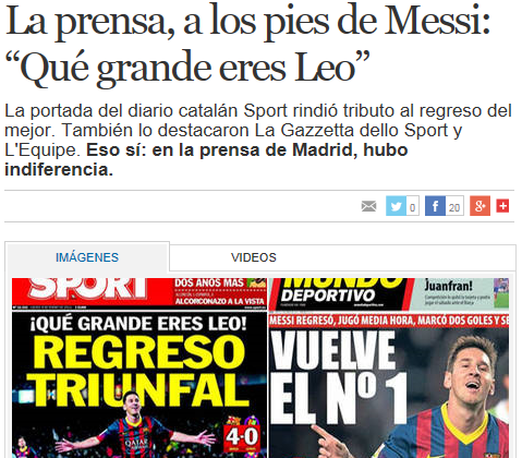 L’article del Clarín explica que els diaris esportius Marca i As a prou feines van dedicar quatre ratlles a Messi i que el van posar a portada perquè era un partit de la Copa del Rei, mentre tots dos diaris van optar per destacar a la portada la renovació de contracte de Xabi Alonso al Reial Madrid .
