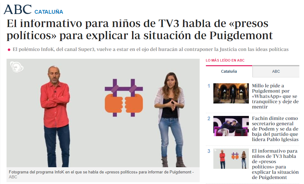 El que s'ha criticat és que ahir l'InfoK va explicar la situació política a Catalunya i va posar de manifest que, de la mateixa manera que hi ha persones que pensen que això no és així, hi ha gent que considera que els presidents de l'ANC i Òmnium, així com els consellers empresonats són 'presos polítics'.