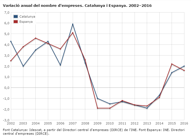 Catalunya ha experimentat un augment d’un 2% en el nombre d’empreses el 2015, un increment més gran que el conjunt espanyol, on la xifra és de l’1,6%. L’estadística mostra recorreguts molt similars entre l’evolució de nombre de companyies a Catalunya i a l’Estat, però precisament l’any passat s’aprecia una trajectòria ascendent al Principat, i descendent a Espanya.