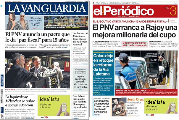 Ni La Razón o El País parlen a les seves portades del pacte entre el PNB i el PP. Silenci en pro de l'estabilitat. Això sí, les portades de la caverna mediàtica quan Catalunya demanava un pacte fiscal denunciaven la vanitat catalana per voler un tracte diferencial i de pretendre tenir privilegis per sobre de les altres comunitats autònomes. En canvi, el relat no és aquest. Fins i tot són benevolents les portades de El Mundo o l'ABC, que sí que tracten el tema. Un cop més, la diferència de tracte entre Catalunya i el País Basc té el rerefons del procés, actiu al Principat i enterrat a les terres basques.