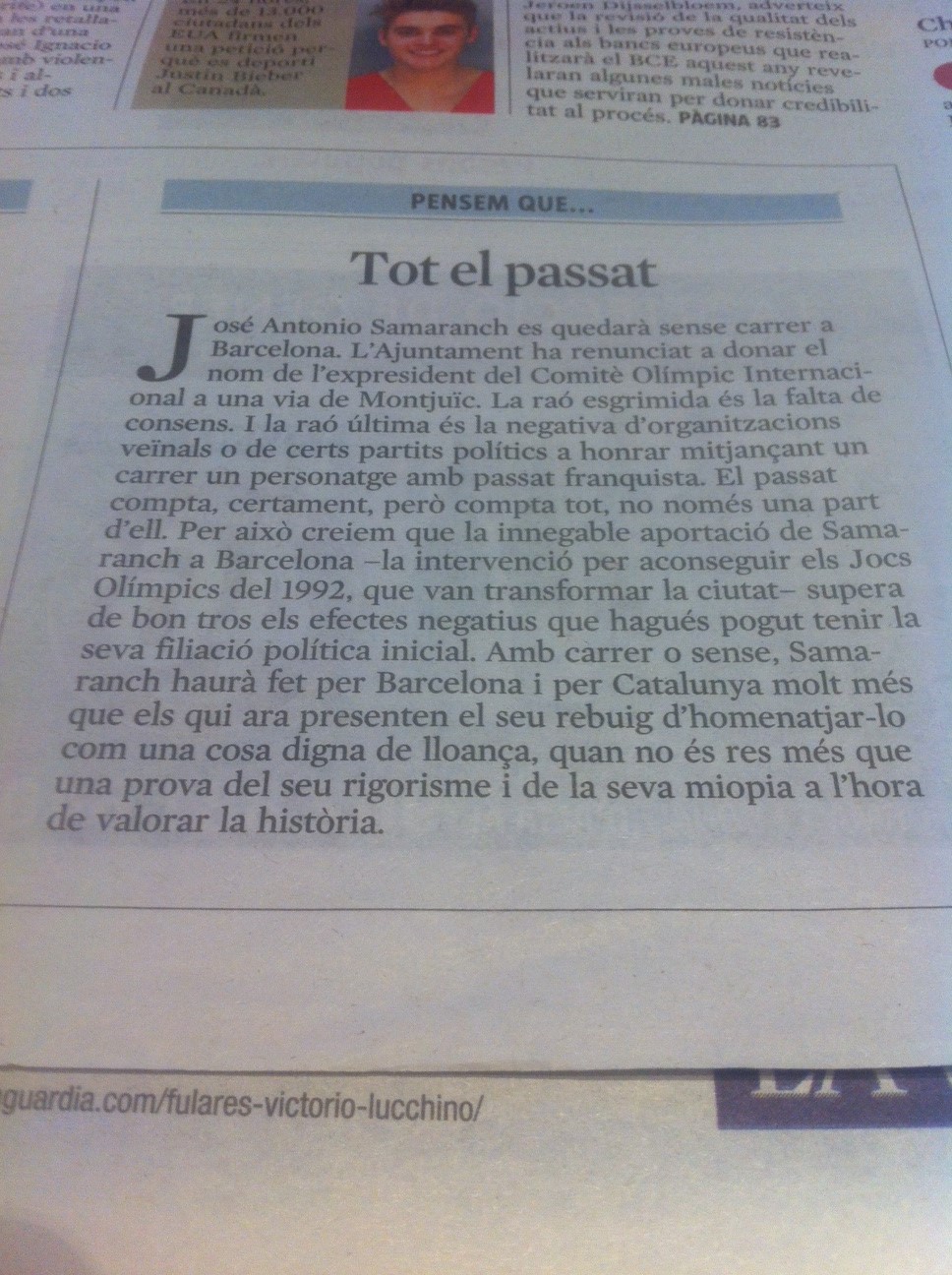 El que no costa d’entendre és que el Grup Godó li deu molt a Samaranch i, sens dubte, la resposta del diari del Grup Godó mostra que alguns es pensen que tenen més força que la ciutadania per tenir un diari, i en aquest cas s’ha vist que per damunt dels lobbys de poder està la ciutadania i les seves entitats. Una mostra que confirma que 260 ciutadans poderosos, per més esperit de #Fonteta que tinguin, no poden acabar amb la voluntat majoritària del poble de Catalunya.
