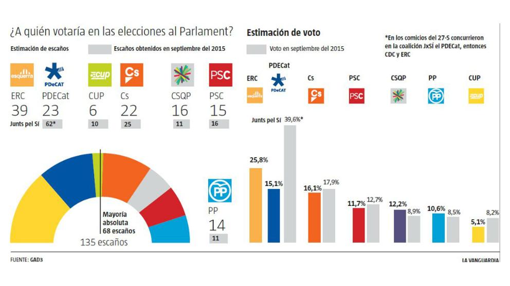 ERC guanyaria amb un marge ampli unes noves eleccions catalanes, segons l'últim sondeig de GAD3 que 'La Vanguardia' ha publicat avui diumenge. El nou arc parlamentari estaria format per ERC (39 diputats), PDeCAT (23), Ciutadans (22), CSQP (16), PSC (15), PP (14) i CUP (6). Per tant, la majoria independentista quedaria reduïda al mínim amb 68 diputats (la meitat més un dels que hi ha al Parlament). L'enquesta es va realitzar entre el 7 i el 12 d'abril i es publica en un moment de tensió entre els dos socis de govern, amb la decisió del PDeCAT de portar a la fiscalia la gravació i posterior filtració de la conversa en la qual el coordinador del partit, David Bonvehí, va plantejar la possibilitat d'optar per un candidat “autonomista” després d'un possible fracàs del procés independentista.