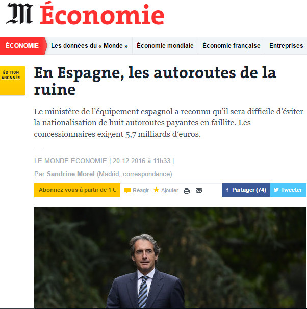 El rotatiu es fa ressò que el ministeri de Foment ha reconegut que li serà difícil d’evitar la nacionalització de les autopistes. A més, fa escarni de la fallida de les carreteres just a l’inici del text: “El silenci regna a l’autopista AP-41, que connecta Madrid amb Toledo al centre d’Espanya; de tant en tant, ens creuem un cotxe, però és estrany”. Amb aquesta caricatura d’una realitat, explica que menys de 800 vehicles utilitzen la ruta cada dia, tot i que les previsions inicials eren de 25.000 quan es va inaugurar el 2006.