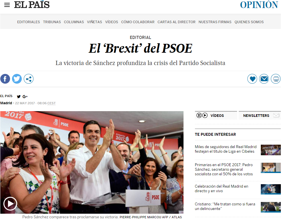 Un altre article d’opinió al mateix diari, signat pel periodista Rubén Amón, referint-se a Sánchez, ha escrit: “I tant representa una apel·lació a les emocions com encimbellada la seva negligència política”. A més, així com en l'editorial d'El País, es mostra escèptic amb què el nou líder socialista pugui fer remuntar el terreny perdut al partit: “Costa feina creure que Sánchez pugui liderar i ressucitar el PSOE que ell mateix ha malaguanyat”.