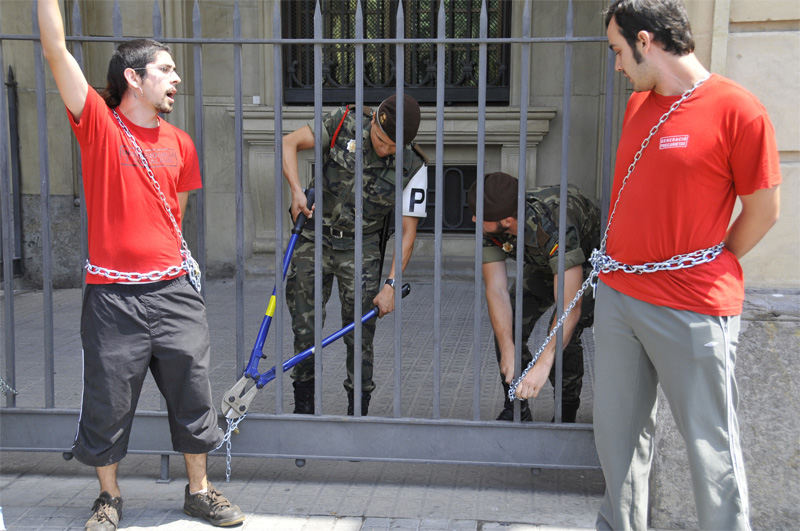 Les joventuts d’ERC denuncien: ‘Ens volen fer creure que l’Estat Espanyol és un país modern i democràtic. Ja han passat més de 30 anys des de la finalització de la repressió franquista i encara a aquest estat queden residus del que va ser aquella dictadura. Les forces armades han resultat formar part del grupuscle que no entenen els valors de la democràcia, i avui encara conserven símbols franquistes, com per exemple dalt en institucions militars o fins i tot algun equipament educatiu’.
