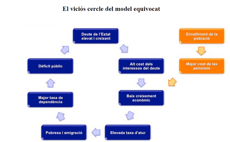 Segons les dades del FMI, Espanya necessitarà quatre anys més per arribar a un creixement del PIB que tot just se situarà per sobre de l’1%; continuar amb un atur del 25% de la població activa; mantenir un dèficit públic del 3% del PIB i amb un deute públic del 105% del PIB.El CCN manté que no es pot crear ocupació si l’economia no creix per sobre del 2,5% del PIB. Els empresaris sobiranistes afirmen que “està demostrat que en el cas d’Espanya la taxa d’ocupació és més sensible al creixement econòmic que en el conjunt d’Europa i requereix, per crear ocupació, un major creixement”. El motiu és que la majoria de l’activitat econòmica espanyola és d’escàs valor afegit, la productivitat és baixa i el mercat laboral excessivament rígid.