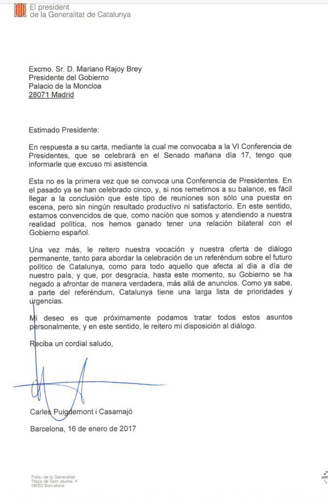 En aquest sentit, és insistent amb la capacitat de diàleg, sabedor que la conferència de presidents amb tota probabilitat és part de l’anomenada ‘operació diàleg’ engegada des de la Moncloa i per evitar així que ningú el pugui acusar de no voler asseure’s a negociar. La missiva, signada pel propi Puigdemont amb data d’avui, deixa clar la voluntat de parlar de tu a tu pel “referèndum”, sinó per la “llarga llista de prioritats i urgències” del Principat.
