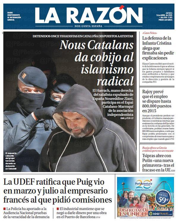 De fet, la denúncia de Manos Limpias és una ampliació de la de que va presentar l’any passat contra funcionaris de la manteixa entitat per presumptes delictes d’associació il·lícita, provocació a la sedició i malversació de fons públics. El suport al ministre d’Interior del sindicat ultradretà se suma al titular d’Exteriors, José Manuel García-Margallo, que ha dit aquest matí: “Si el ministre, que és el responsable d’aquests temes, fa aquestes afirmacions, estic segur que és perquè té informacions fiables i més que solvents”. La Razón també dóna màxima veracitat a Fernández Díaz amb la portada: “Nous Catalans donen aixopluc a l’islamisme radical”.