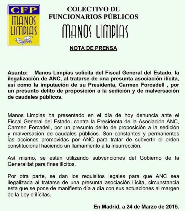 De la mateixa manera, Manos Limpias justifica que la il·legalització que es demana es justifica en el fet que “s'incompleixen les normes del jocs democràtic i del respecte a l'Ordenament vigent”, així com en el fet que l'ANC vulnera “constantament” els principis de l'Estat de Dret.