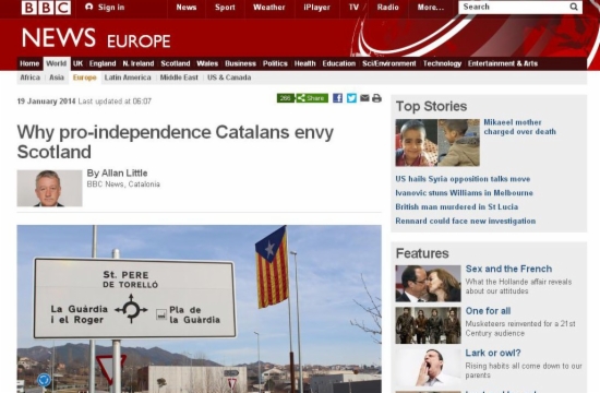 El periodista Alan Little entrevista durant el reportatge el president de la Generalitat, Artur Mas, que assegura que vol fer un referèndum d'independència el novembre. “Espanya, però, ha dit que la decisió és il·legal i que el referèndum no es farà”, remarca la BBC. “No és il·legal. El govern espanyol diu que els nostres plans són il·legals, però no és veritat. Hem identificat cinc marcs legals diferents per organitzar i fer la consulta”, assegura Mas. La televisió britànica admet que la situació té un “marcat contrast amb la d'Escòcia”, on es va arribar a un acord “sobre el moment de la votació i la pregunta”.