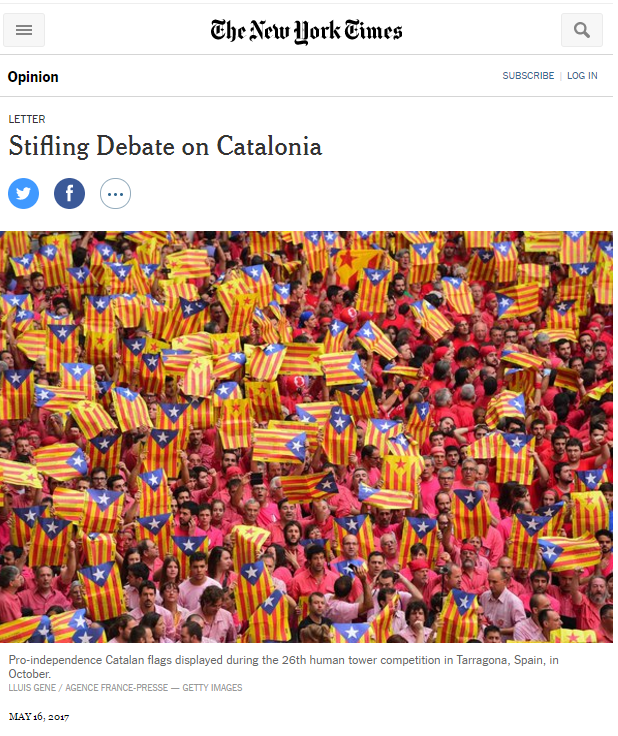 El text, titulat ‘Sufocant debat sobre Catalunya’, afirma que “sigui la que sigui la vostra opinió sobre la independència de Catalunya, la qüestió clau ara és si s’està d’acord o no que les diferències polítiques s’han de resoldre mitjançant la llibertat d’expressió i la democràcia”. Un comentari que fa just després de mencionar que la presidenta del Parlament, Carme Forcadell, va haver d’anar al jutjat fa uns dies per defensar-se d’una acusació “per haver permès als representants electes un debat sobre la independència”.
