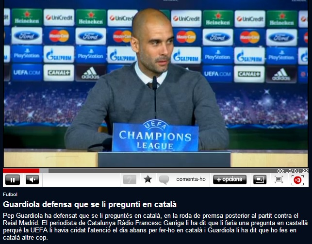 El periodista de Catalunya Ràdio, Francesc Garriga, li ha dit que li faria la pregunta en castellà ja que la UEFA li havia cridat l’atenció en la previa per fer-ho en català. La sorpresa ha saltat en el moment que Guardiola li ha dit: “T’equivoques, pots fer-ho en català”. D’aquesta manera i tal com és veu en aquest vídeo, el periodista de Catalunya Ràdio li ha fet la pregunta en català i l’ha traduït al castellà, en la resposta Guardiola ha fet el mateix en català i després l’ha traduït al castellà.