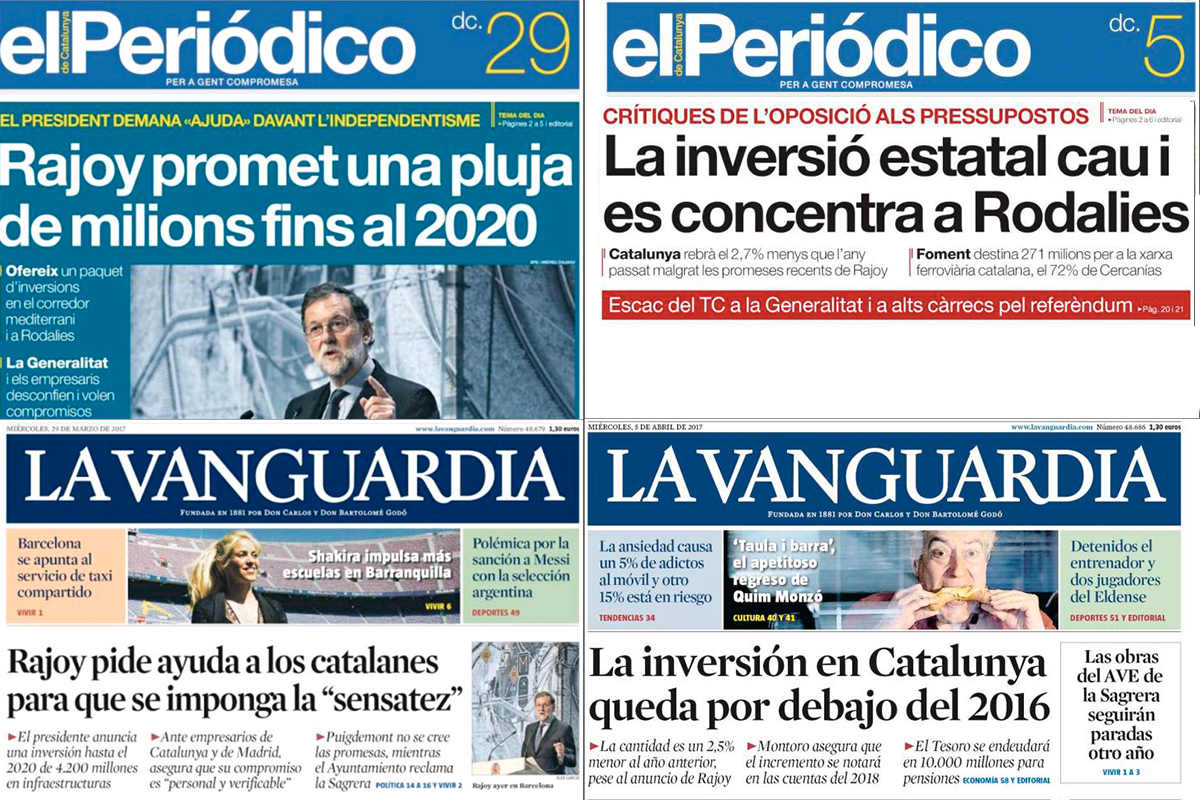 És una tònica habitual que El Periódico i La Vanguardia posin un semàfor vermell o puntuïn molt malament a les figures destacades del dia, tanmateix, avui ha sobtat que cap dels dos s'hagi atrevit a personalitzar en Mariano Rajoy el fet que una setmana després de prometre 4.200 milions en inversions els pressupostos generals de l'Estat no només constatin el dèficit fiscal crònic de Catalunya i els Països Catalans, sinó que desmenteixen els grans titulars com el d'El Periódico que anunciava una “pluja de milions” quan en realitat ha retallat 30 milions la inversió en comparació amb les xifres del 2015.