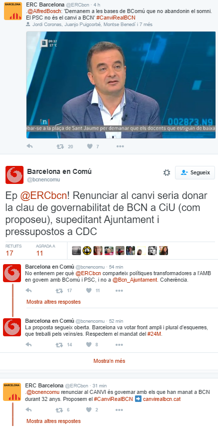 Tot ha començat amb una piulada del compte d’ERC a la ciutat comtal que recollia unes declaracions d’Alfred Bosch en una entrevista a BTV: “Demanem a les bases de BComú que no abandonin el somni. El PSC no és el canvi a BCN”. Unes hores després, la plataforma que va guanyar les eleccions de fa un any ha respòs: “Ep @ERCbcn! Renunciar al canvi seria donar la clau de governabilitat de BCN a CiU (com proposeu), supeditant Ajuntament i pressupostos a CDC”. L’argument de Barcelona en Comú contrasta amb la realitat: al final els pressupostos d’enguany van acabar estant supeditats a la pròpia ERC i, sobretot, a la CUP.