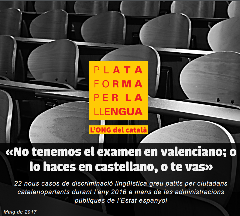 El cas que la Plataforma per la Llengua ha utilitzat per titular l’informe és el d’un examen d’oposició a auxiliar administratiu a l’Ajuntament de Godella, el País Valencià. Un dels candidats va demanar la versió en valencià de la prova, però el president del tribunal va dir-li: “El examen no lo tenemos en valenciano y no te lo vamos a dar; así que o lo haces en castellano o te vas”. El rebombori es va fer tan gran que la prova va acabar sent declarada nul·la. Un altre cas és el de l’expulsió d’un home d’una oficina de Correus de Barcelona per alertar que només tenien postals de felicitació en castellà: “Estamos en España”, li va etzibar el director de la sucursal.