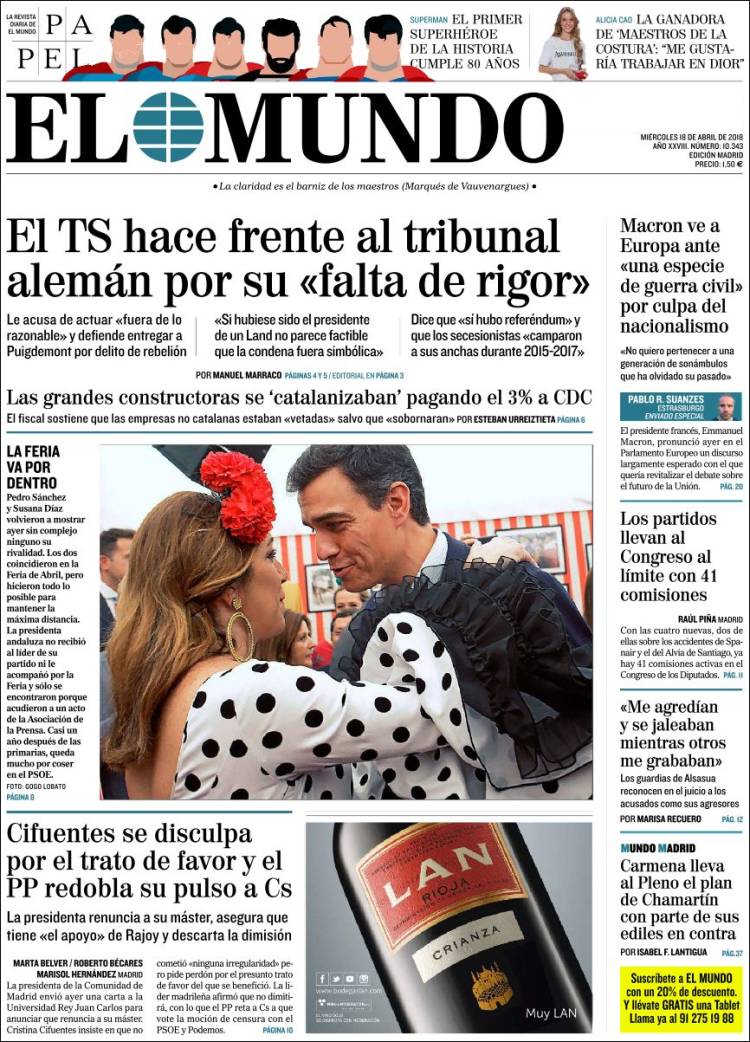 El Mundo titula “El TS hace frente al tribunal alemán por su “falta de rigor”” i defensa l'extradició de Carles Puigdemont. El rotatiu recull la interlocutòria del Suprem que matisa la violència de l'1-O i obre la porta a rebaixar el delicte de rebel·lió a sedició. Tot i això, El Mundo se centra en les crítiques del tribunal que jutja la causa independentista contra Alemanya i l'acusa d'actuar “fora del que és raonable”