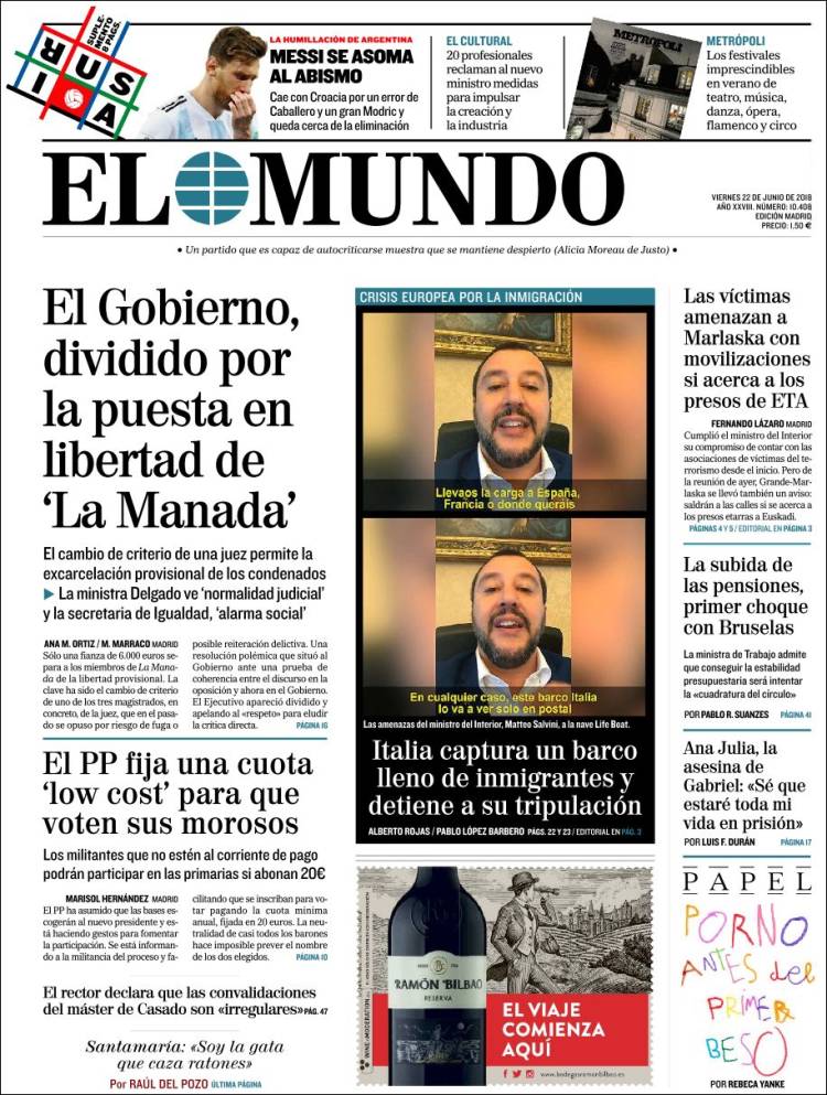 “El Gobierno, dividido por la puesta en libertad de 'La Manada”, titula El Mundo, que assenyala que la ministra Delgado veu “normalitat judicial” i la secretaria d'Igualtat, “alarma social”.