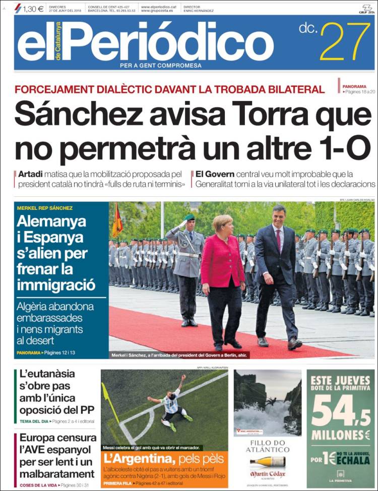 “Sánchez avisa Torra que no permetrà un altre 1-O”, titula El Periódico, que assegura que el govern central veu improbable que el govern de la Generalitat torni a la via unilateral.