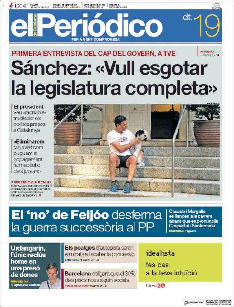 “Sánchez vol esgotar la legislatura completa” titula El Periódico, que destaca la primera entrevista del president del govern espanyol a TV1 on va dir que veu “raonable” acostar els presos a Catalunya.