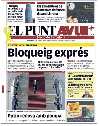 Després d'aprovar la reforma de la llei de presidència el Gobierno es reuneix aquest dimarts per intentar suspendre-la. Així ho recull El Punt Avui: “Bloqueig exprés”. La Vanguardia, per la seva banda du en portada el reclam d'Esquerra: “ERC reclama a Puigdemont que pacti els pròxims passos”.