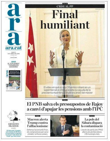 També es concentren amb aquest tema La Razón: “Cifuentes dimite”. Ara: “Final humiliant”. ABC: “La “obligada” dimisión de Cifuentes”. El Mundo: “Un vídeo humillante guardado desde 2011 remata a Cifuentes”. I La Vanguardia: “Cifuentes cau a la fi i deixa el PP immers en el desànim”.