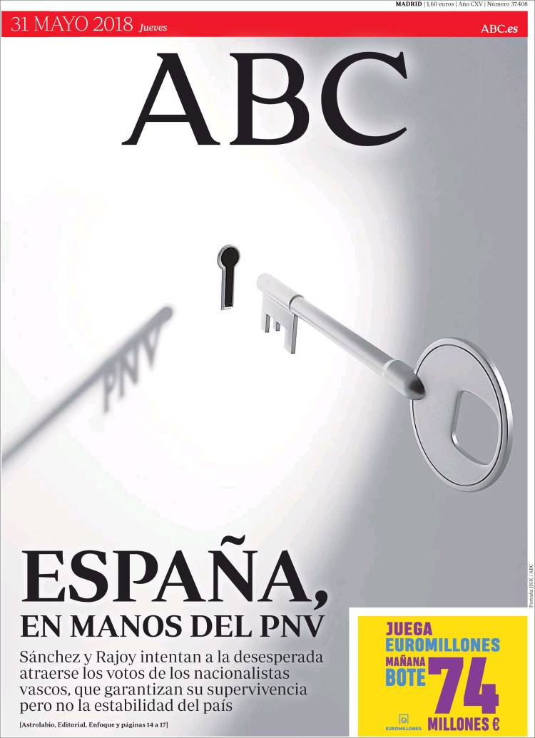 “España, en manos del PNV”, titula l'ABC, que assenyala que tant Sánchez com Rajoy intenten a “la desesperada” atraure's els vots dels nacionalistes bascos, que “garantiran la seva supervivència però no l'estabilitat del país”.