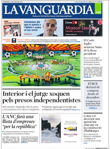 I La Vanguardia: “Interior i el jutge xoquen pels presos independentistes”.