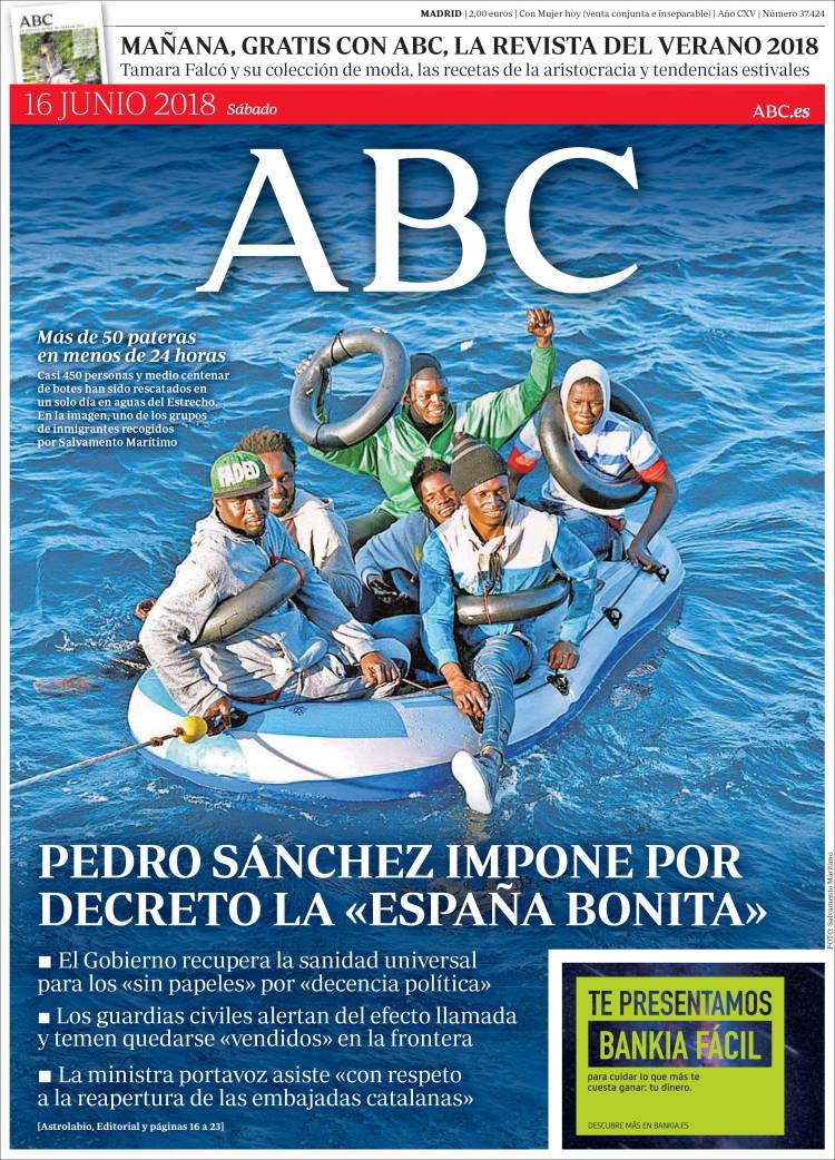 “Pedro Sánchez impone por decreto la 'España bonita'”, titula l'ABC, que destaca que el govern recupera la santiat universal per “decència política” i avisa que els guàrdies civils pateixen per quedar-se 'venuts' a les fronteres”.
