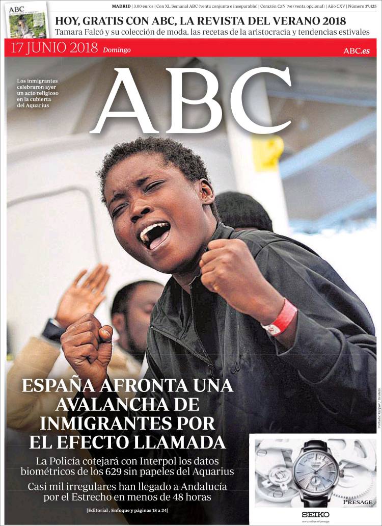 La Razón i El Periódico també se centren en l'arribada de l'Aquarius. La Razón destaca “el naufragio de la Unión Europea”, i assenyala la manca de projecte comú i ús polític de la immigració. El Periódico parla de “SOS immigració” i assegura que Sánchez prepara “un gir de model d'acollida i integració després de la deixadesa del PP”.