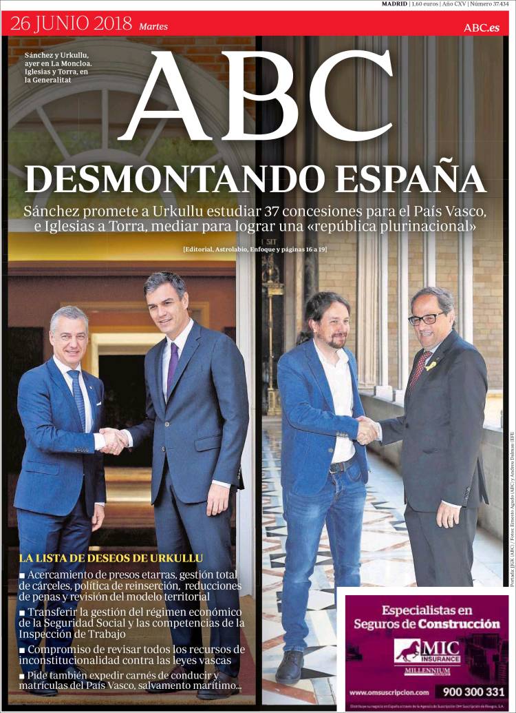 “Desmontando España” titula l'ABC, que recull que Sánchez promet a Urkullu 37 concessions pel País Basc i Iglesias a Torra, fer de mediador per aconseguir una “república plurinacional”.