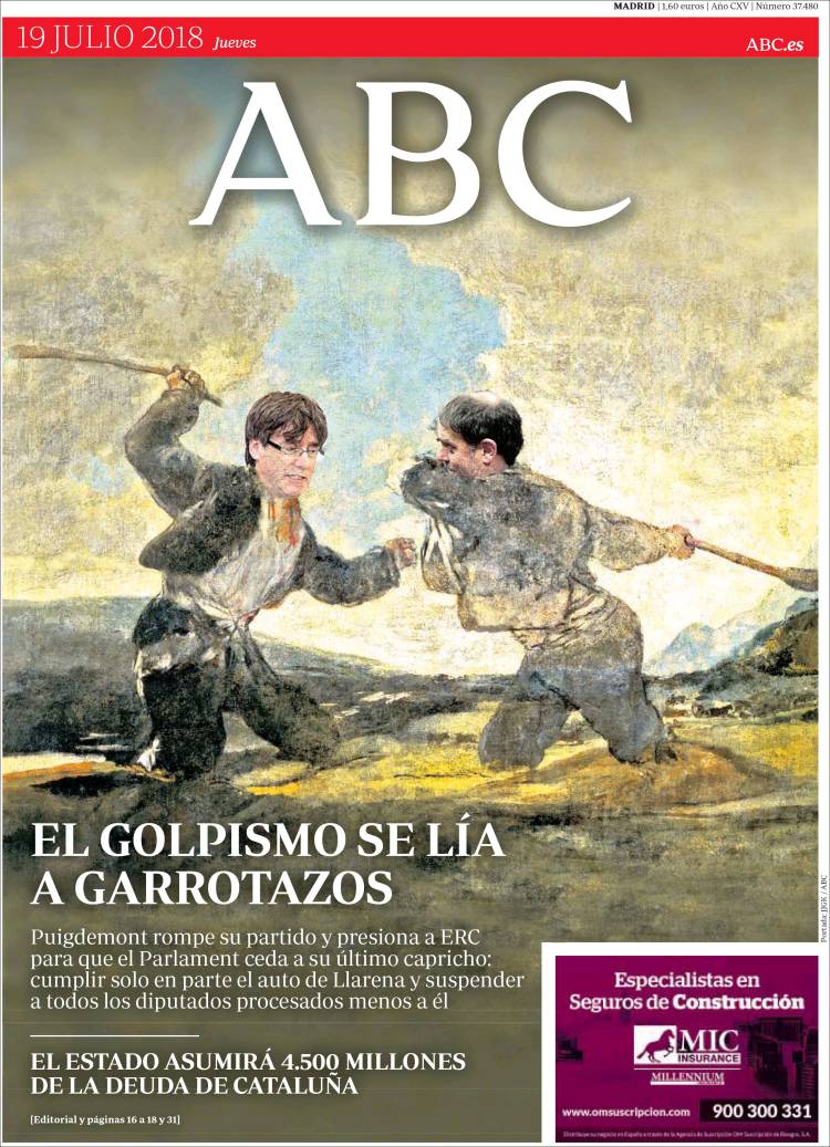“El golpismo se lía a garrotazos”, titula l'ABC, que il·lustra la portada amb el quadre de Francisco Goya 'Duel a garrotades', que representa dos brivalls lluitant a garrotades en el fang i posen la cara de Carles Puigdemont i d'Oriol Junqueras. Tanmateix expliquen que “Puigdemont trenca el seu partit i pressiona ERC perquè el Parlament cedeixi al seu últim caprici”.