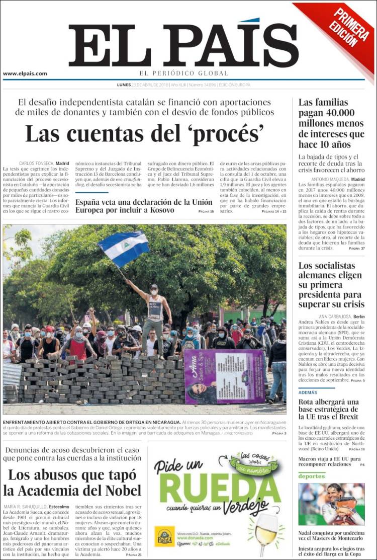 El País insisteix amb “Las cuentas del procés”. El rotatiu assegura que el procés independentista es va finançar amb aportacions de milers de donants i també “amb desviaments de fons públics”. Malgrat que Rajoy i Montoro hagin repetit que l'1-O no es va finançar amb diners públics, la caverna mediàtica espanyola compra la tesi de Llarena i insisteix en la malversació del govern de la Generalitat.