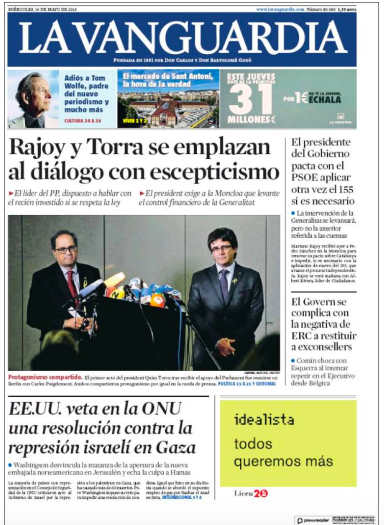 La Vanguardia recull l'intent de diàleg entre el president del Gobierno i el nou president de la Generalitat. “Rajoy i Torra se citen al diàleg amb escepticisme”. També ho recull El Periódico: “Rajoy accepta parlar amb Torra “dins la llei””. El Punt Avui menciona també aquesta reunió amb un toc diferent. “President Rajoy, marqui lloc i hora”.