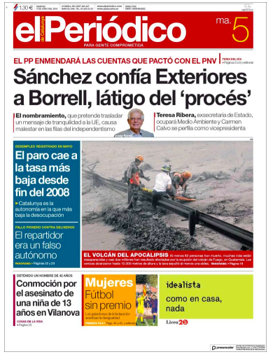 Així ho recullen alguns diaris. El Periódico: “Sánchez confia Exteriors a Borrell, flagell del procés”. El Punt Avui: “Primer “gest” de Pedro Sánchez”. Ara: “Pedro Sánchez fitxa Borrell per a Exteriors”. El Mundo: “Sánchez ficha a Borrell para compensar sus guiños a la Generalitat”. I La Vanguardia: “Borrell dirigirà Exteriors, i Batet, la política autonòmica”.