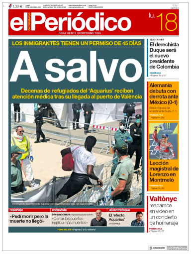 El Periódico es limita a dir “Salvats”, l'Ara titula “Rebuda amb incògnites”, en el mateix sentit va el destacat de La Vanguardia que diu que “Espanya acull els nàufrags amb dubtes sobre on aniran” i l'ABC destaca: “Casi la mitad de los sin papeles del Aquarius piden asilo en Francia”.