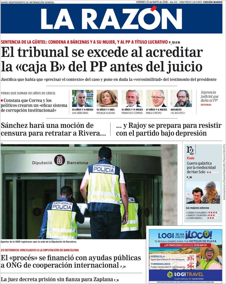 “El tribunal se excede al acreditar la “caja B” del PP antes del juicio” titula La Razón, que destaca que “Sánchez farà una moció de censura per a retratar Rivera i Rajoy es prepara per resistir amb el partit sota depressió”.
