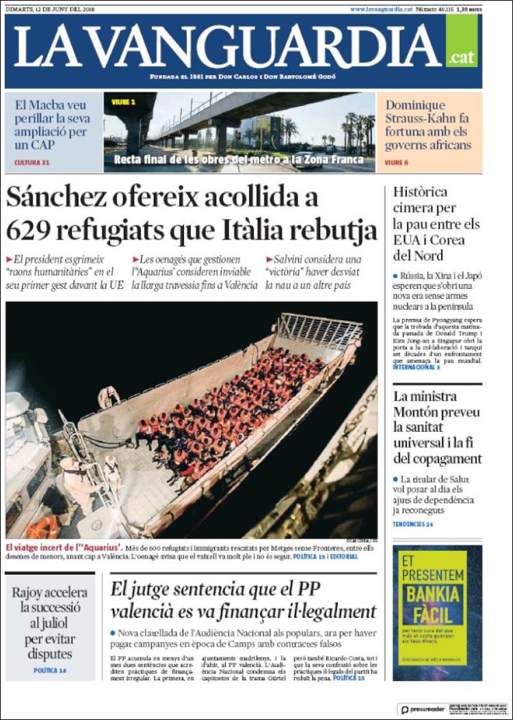 Per la seva banda, l'ABC i La Vanguardia se centren en la decisió del govern espanyol. “España se ofrece para acoger a los 629 inmigrantes del Aquarius” titula l'ABC mentre que La Vanguardia destaca que “Sánchez ofereix acollida a 629 refugiats que Itàlia rebutja”.