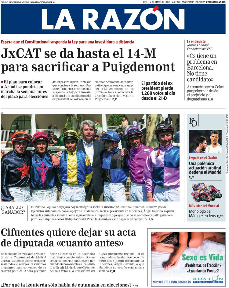 “JxCAT se da hasta el 14-M para sacrificar a Puigdemont”, titula La Razón, que afirma que la formació està esperant que el Tribunal Constitucional suspengui la llei per a la investidura a distància i engegar el pla D. Tanmateix, assegura que el partit perd més de 1.200 vots al dia des del 21-D.