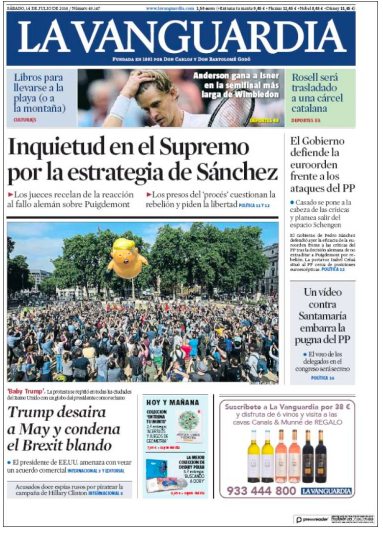 'La Razón': “”Ataúdes de guardias” para patrullar contra el narcotráfico”. 'ABC': “Un Trump desbocado de paso por la vieja Europa”. 'El Mundo': “La mayoría ve a Sánchez muy blando con los separatistas”.