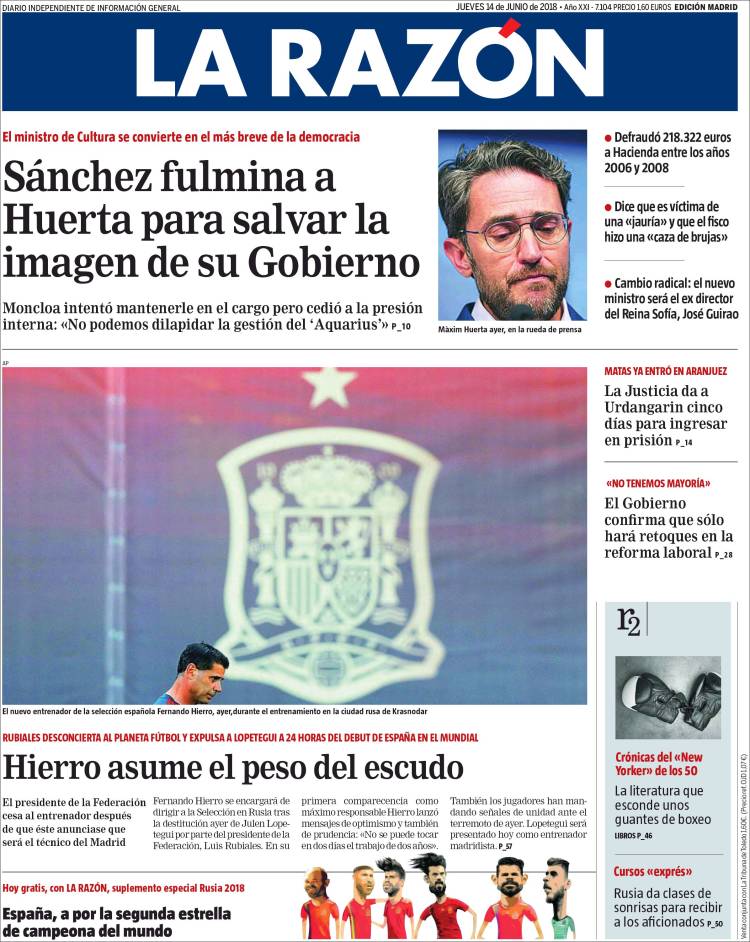 El País també recull que “El ministro de Cultura cae por defraudar a Hacienda” mentre que El Mundo fa un joc de paraules amb el nom de Huera i titula: “Màxim, ministro mínimo”.
