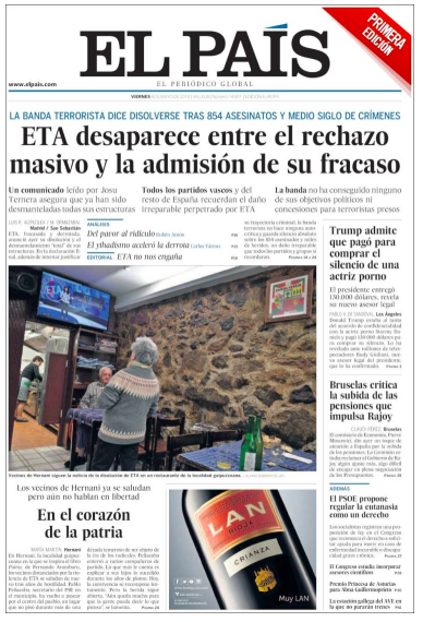 Les portades se centren aquest divendres de manera unànime amb la fi d'ETA. La banda armada ha anunciat que cessa la seva activitat de manera indefinida. El País: “ETA desaparece entre el rechazo masivo y la admisión de su fracaso”. El Periódico: “Llibertat polèmica”. El Punt Avui: “ETA: Punt final”. Ara: “ETA s'ha acabat”.