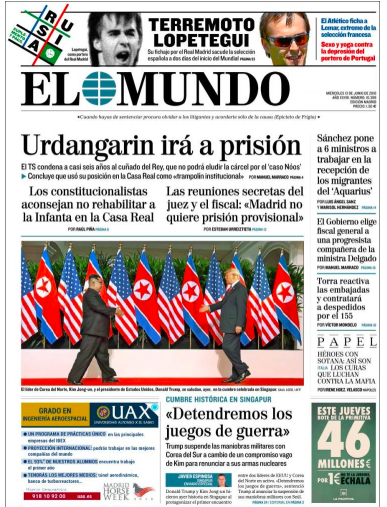 La premsa se centra, unànime, en la sentència d'Urdangarin a cinc anys i 10 mesos pel Cas Nóos. El País: “El Supremo condena a cinco años y 10 meses a Urdangarin”. El Periódico: “Urdangarin, a la presó”.