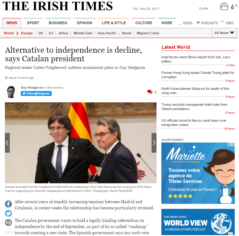 L’article intercala les paraules de Puigdemont amb elements per contextualitzar el moment polític català on, fins i tot, es fa ressò de la carta de l’Oficina de l’Alt Comissionat de l’ONU pels Drets Humans tocant el crostó a Madrid pel judici a Artur Mas i la negativa al plebiscit. El cap de l’executiu català ha rematat l’estirada d’orelles dient que en 40 anys de democràcia “hem trobat que el reconeixement de Catalunya és impossible dins el sistema espanyol i que per continuar sent espanyols hem de deixar de ser catalans”. Al mateix temps, però, ha dit que en qualsevol cas cap ciutadà ni empresa catalana es quedaran fora de la UE.