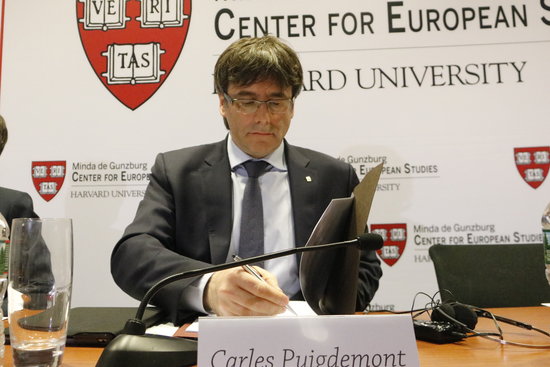 Puigdemont ha pronunciat la seva conferència davant prop d'un centenar de persones –la sala s'ha omplert-, en la seva majoria estudiants i professors del Center of European Studies de la Harvard University. En la seva intervenció, que ha començat recordant i citant Pau Casals, el president ha posat les reivindicacions sobiranistes dels catalans al costat de les batalles més emblemàtiques dels nordamericans per les seves llibertats i drets. “La nostra lluita és un reflex de la lluita pels drets civils nord-americans. Les institucions americanes han respectat la democràcia i la voluntat de la seva gent a adaptar-se als nous temps”, ha dit quasi al final de la conferència. A més, ha remarcat que la Constitució dels Estats Units pertany al poble nord-americà, i no a l'inrevés”. “Fins a 27 vegades s'ha modificat. Fins a 27 vegades s'ha adaptat als objectius del poble nord-americà. Gràcies a això, es va abolir l'esclavitud. Gràcies a això, les dones i els homes poden votar. Gràcies a això, la segregació és una cosa del passat. El Govern espanyol ha d'escoltar la seva gent i respectar els drets civils”, ha etzibat, criticant així també l'actitud de l'Estat amb el procés.