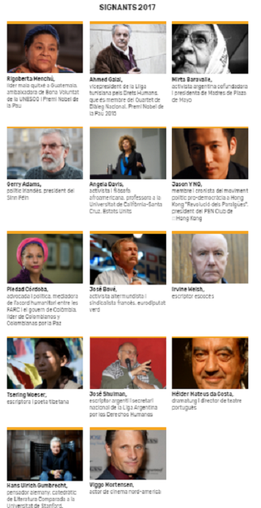 Les noves personalitats que també se sumen a la crida mundial per a fer possible el dret a decidir del poble de Catalunya són la política i filòsofa afroamericana Angela Davis; Mirta Baravalle, presidenta de Madres de la Plaza de Mayo, José Bové, activista altermundista i sindicalista francès, Piedad Córdoba, política mediadora de l’acord humanitari a Colòmbia, Tsering Woeser, escriptora tibetana, Jason Y NG, membre i cronista de la “Revolució dels Paraigües” a Hong Kong, Irvine Welsh, escriptor escocès, José Shulman, secretari de la Lliga argentina pels Drets Humans, Hélder Costa, dramaturg portuguès i Hans Ulrich Gumbrecht, pensador alemany, catedràtic d’Stanford.